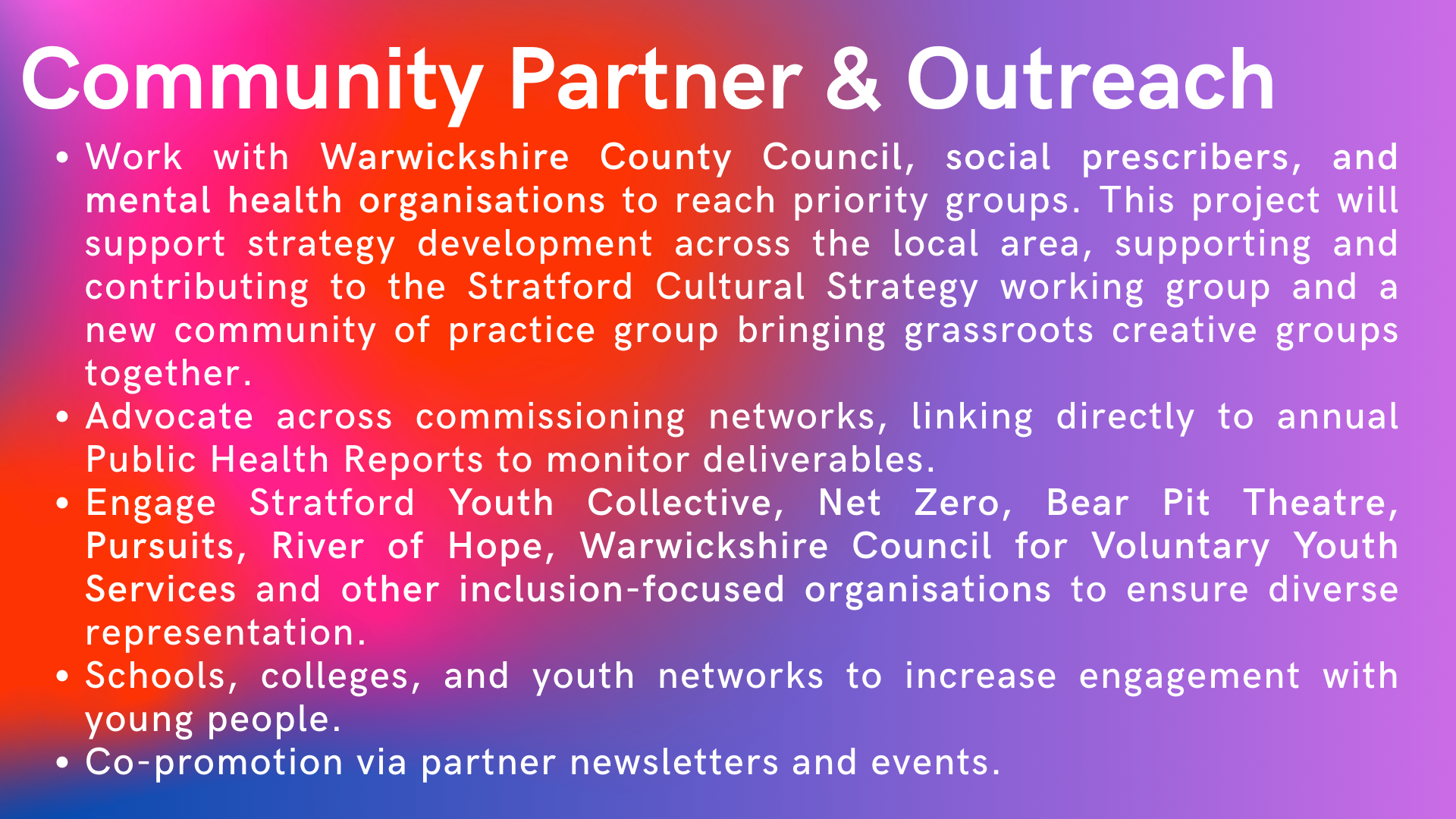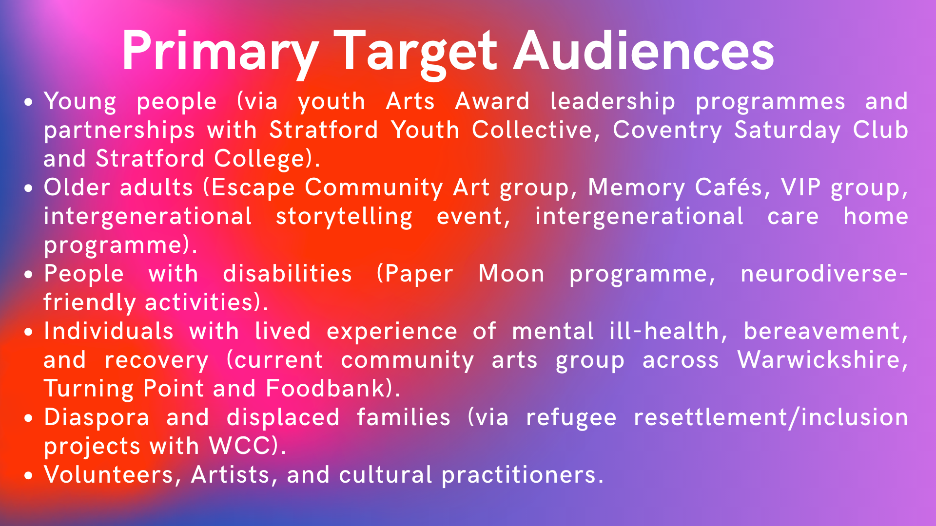 Escape Arts works closely with Warwickshire Pride both in terms of being a founding member of Stratford Youth Collective and supporting their Pride Festivals across Warwickshire. We look forward to supporting the Warwickshire Libraries Hidden Stories project as part of Extraordinary Lives, working together with Artist Lead Kirsty Brewerton to ensure stories are heard and celebrated as part of the legacy of the People's Archive.