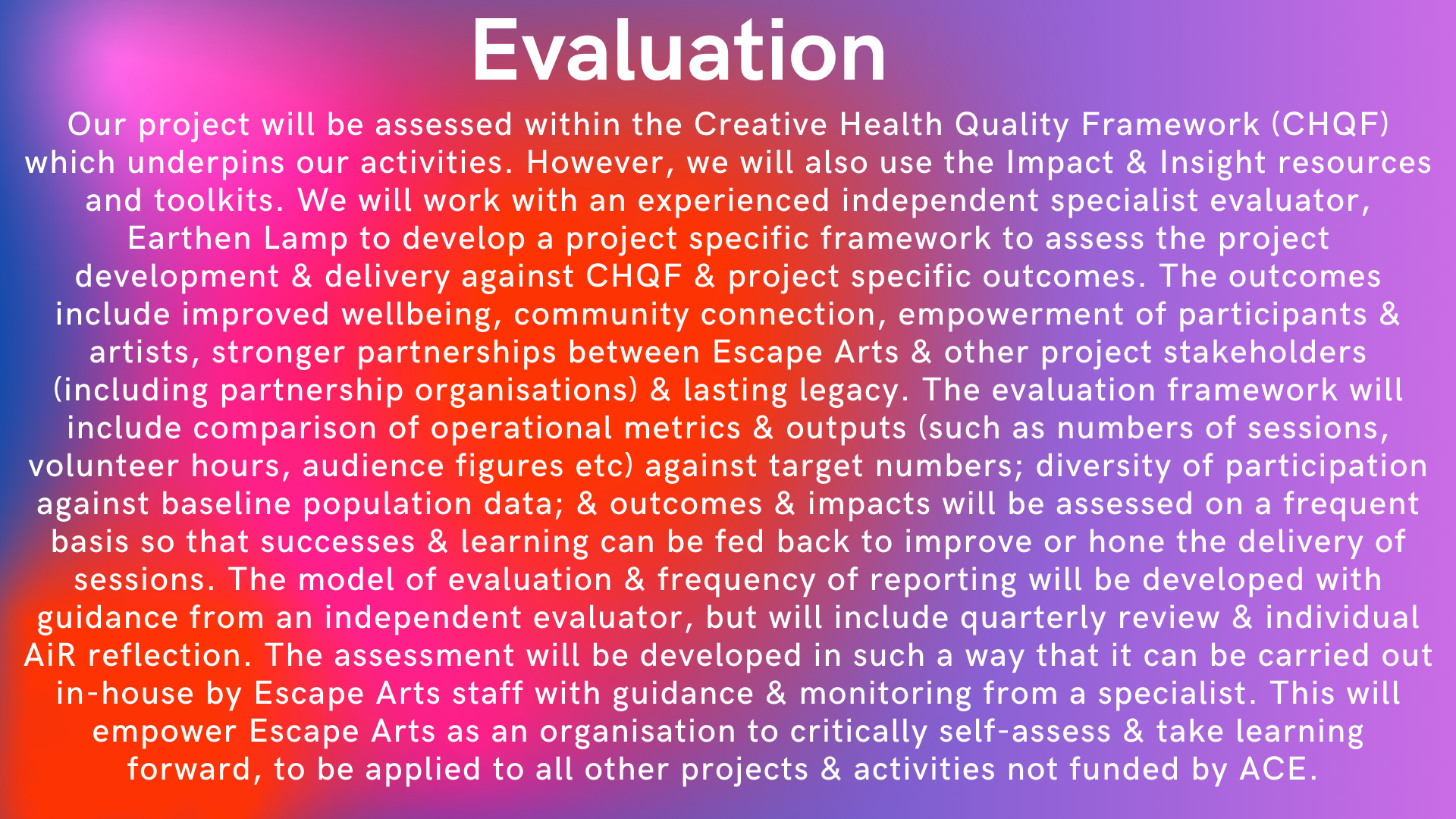 Escape Arts has an extensive history of providing creative opportunities for young people. Escape Arts is a founding member of Stratford Youth Collective. This new youth-led initiative which provides universal youth provision across Stratford and South Warwickshire. As part of the Collective, we provide creative leadership opportunities through our Young Creatives National Arts Award Accreditation with Trinity College London. This provides professional mentoring, work experience and project management work, investing in our future young creative lead across the cultural sector.